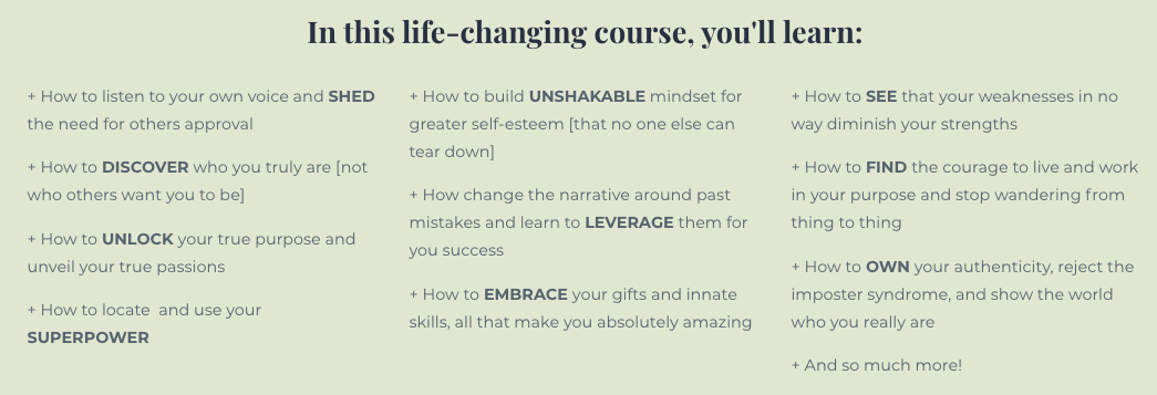 This highly-valuable program is paced with 6 Modules and 49 Mini-Lessons toĀ help you to let go of what's been holding you back, change the narrative that other's have created for you, and stop the self-sabotaging behavior that's kept you from havingĀ an authentic, fulfilling and meaningful life, business or career.